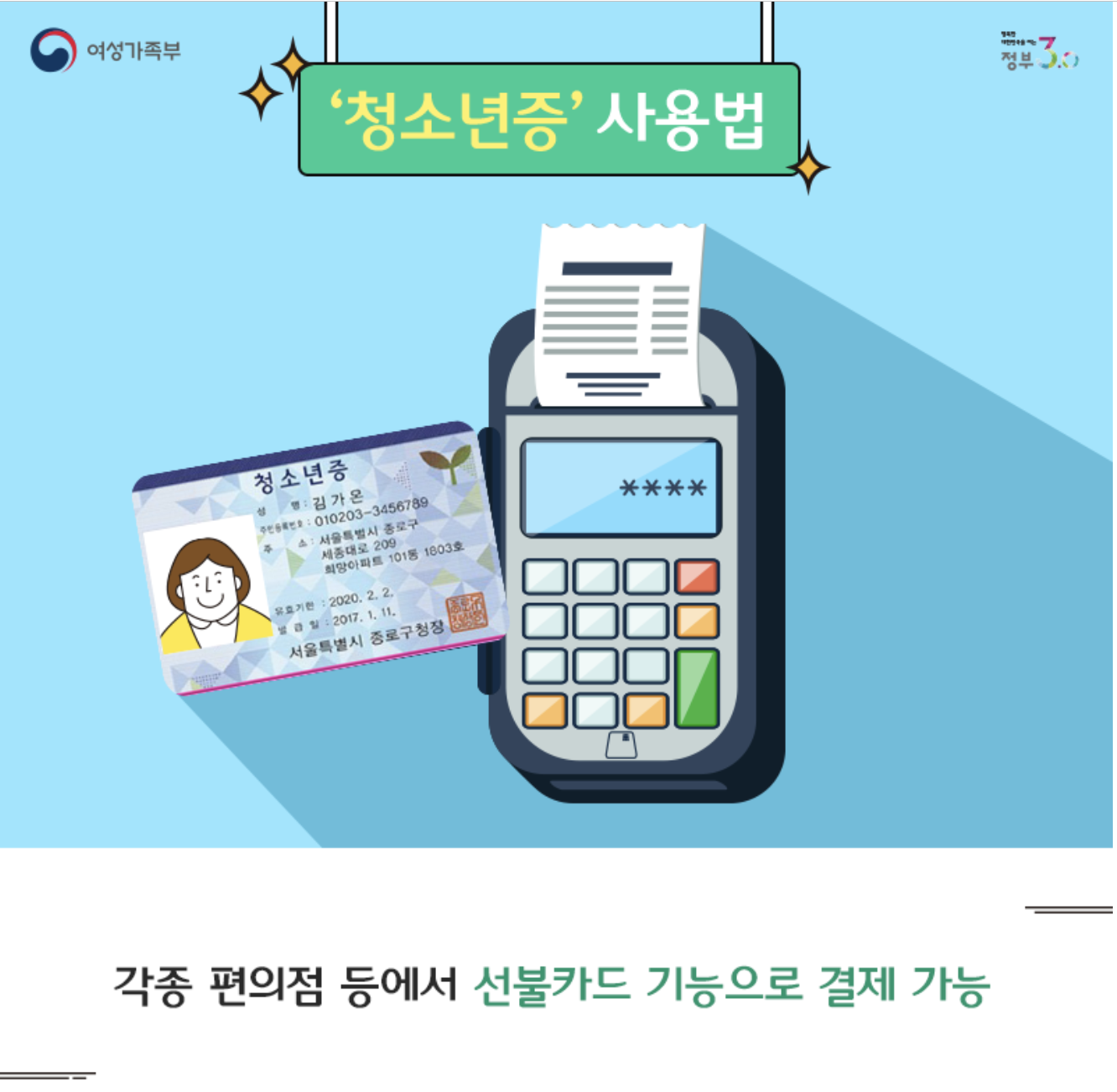 청소년증을 신청할 때 교통카드 기능을 추가하여 교통카드로 사용이 가능합니다. 또한 대중교통울 이용 할 때 할인 혜택을 받을 수 있습니다.