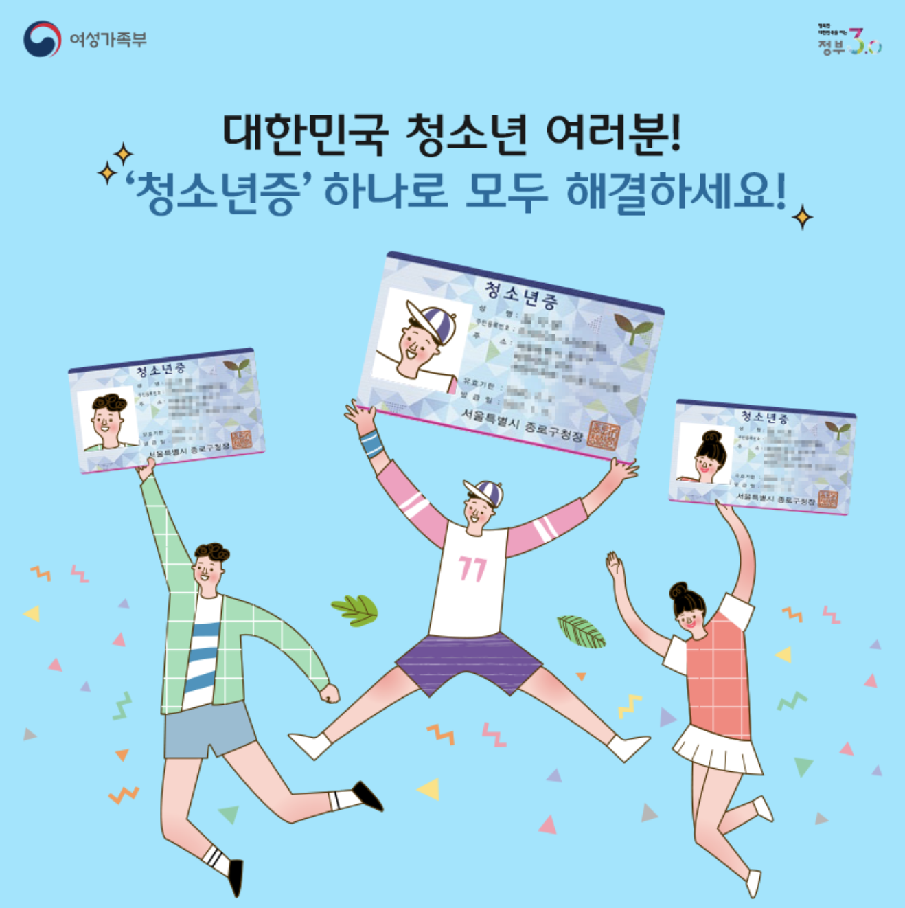 청소년증은 청소년기본법 및 청소년복지지원법 제3조 및 제4조에 따라 9세에서 18세 사이의 청소년들에게 발급되는 신분증입니다. 공적 신분증으로 사용할 수 있으며, 교통카드 기능은 물론 각종 할인 혜택을 받을 수 있습니다. (학생 여부와 무관)