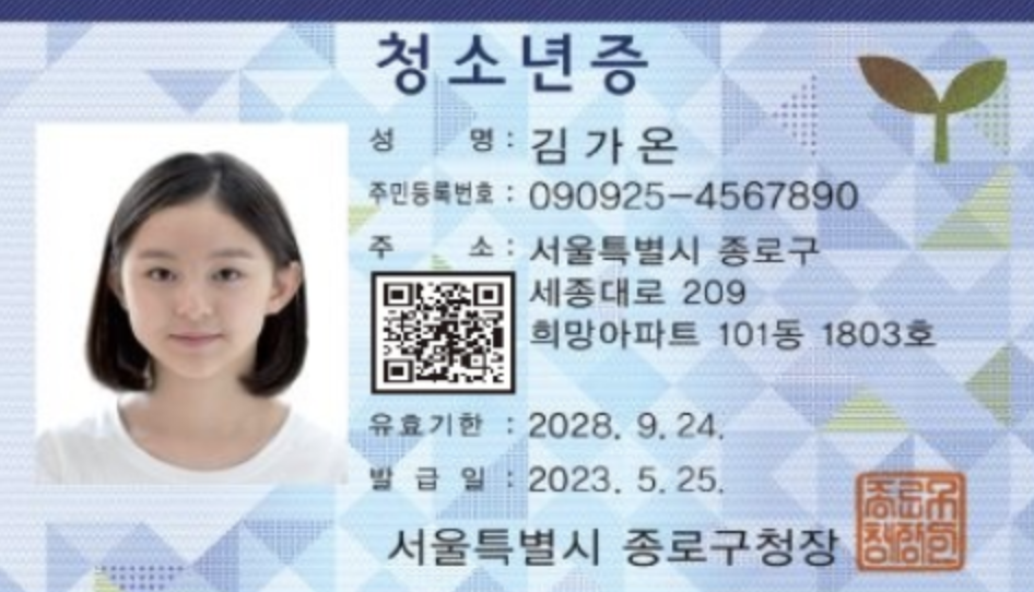 청소년증은 주민등록번호가 기재되어있어 대학수학능력시험, 검정고시, 운전면허시험, 금융기관 등에서 신분을 증명해 주는 공적 신분증으로 사용할 수 있습니다